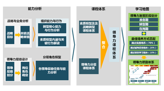 领导力学习地图主要根据不同的领导力层级,定义不同领导层级的角色模型。基于角色模型提炼出的知识、技能和素质,进一步对掌握程度的现状及未来要求进行分析,并考虑角色当前承担差距和紧迫程度,匹配培养方式,形成领导力学习地图。