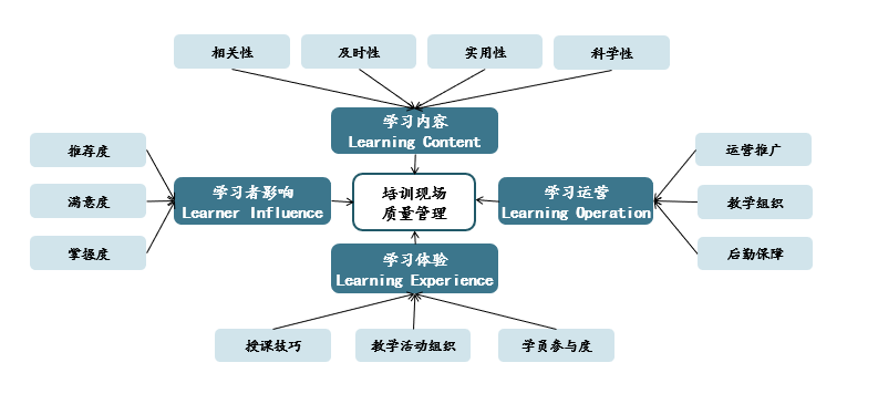 学习体验 以考察课程的教学设计、教师的授课能力、学习氛围为主,有效的教学设计是确保培训质量的关键。该管控点包含授课技巧、教学活动组织、学员参与度三个指标。
