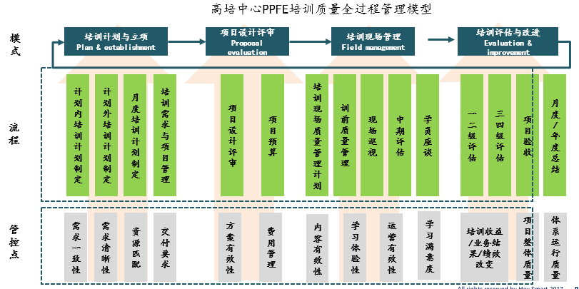PPFE模型既有宏观管理,又有微观管理;既照顾到了培训全流程,又考虑了资源的投入产出。PPFE模型的设计基于“模式-流程-管控点”三级维度(见图表1)。