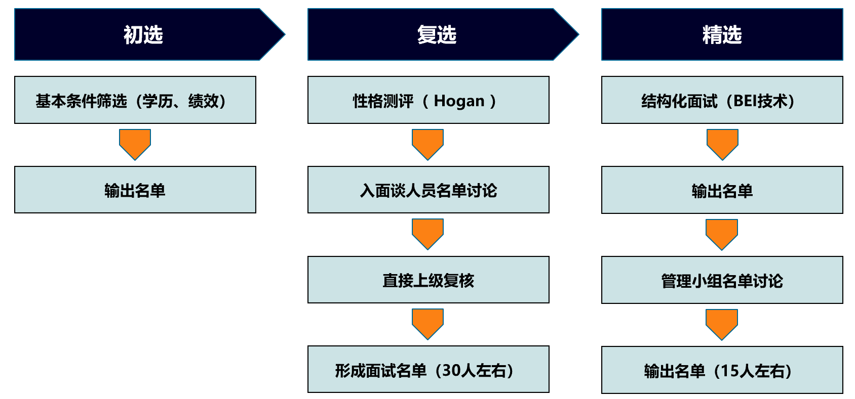 在高潜人才计划实施前,人力主管部门会对楼内外岗位序列人才需求进行测算和评估,拟定入选人才数量需求。在甄选环节,合思管理针对地服部情况,建立了初选、复选、精选的三级筛选机制,通过自荐、部门推荐、专业测评等多手段结合,对候选人的资质、学历、绩效、发展潜力、经历等进行了全方位的评估。